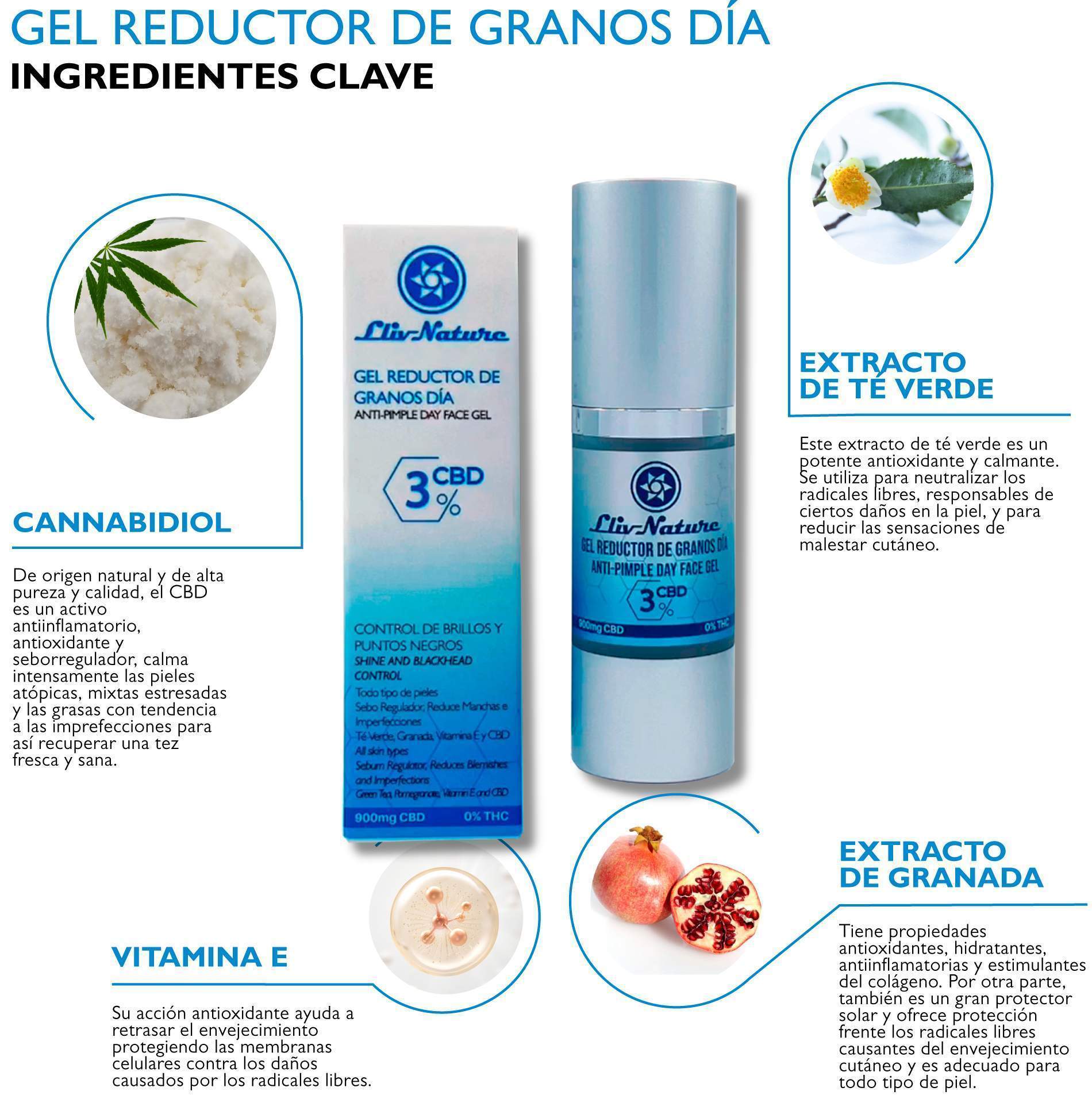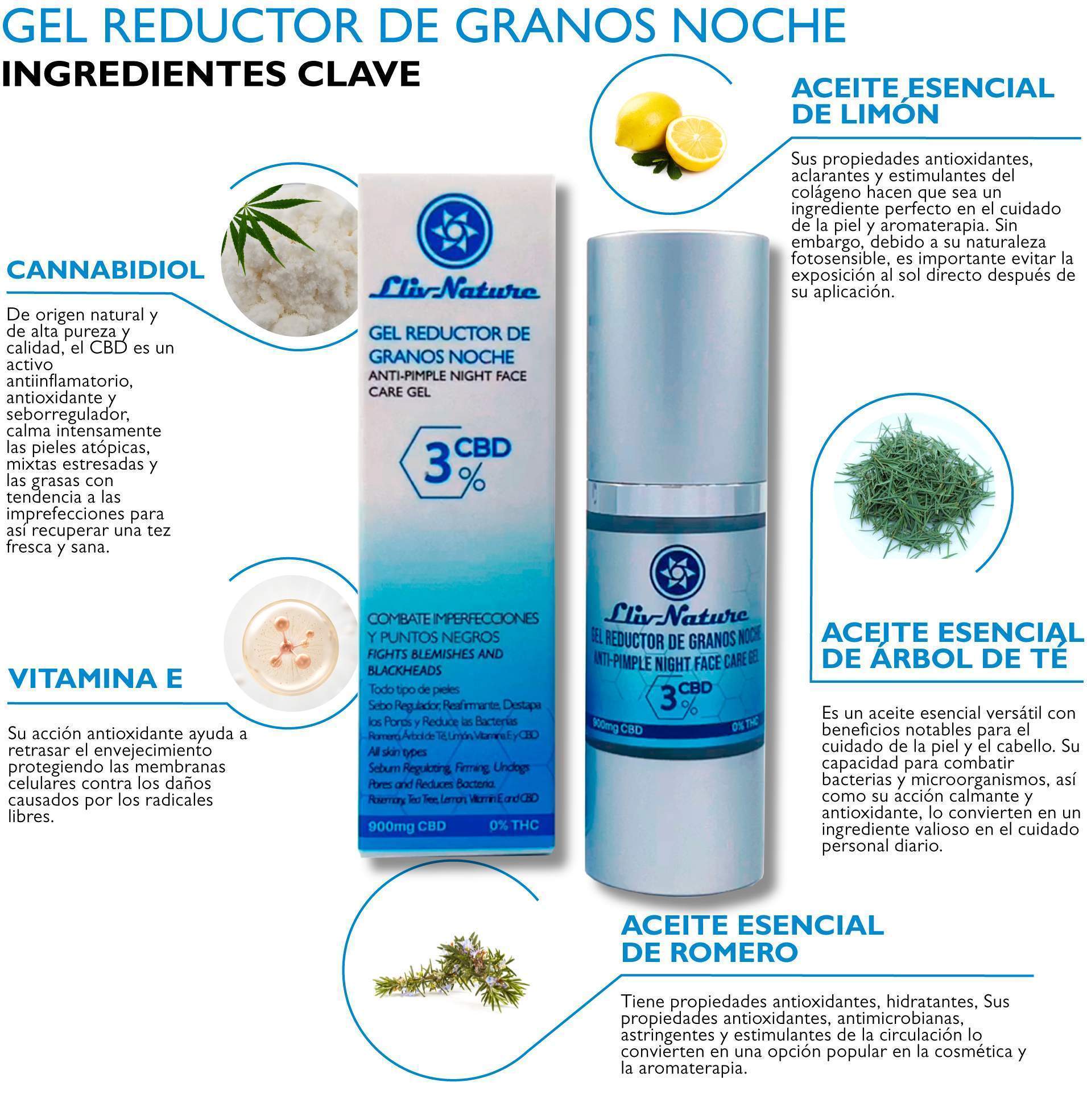 Gel Facial de textura ligera y no graso que ayuda a reducir los granos, abre los poros obstruidos y reduce visiblemente las imperfecciones. Contiene un 95% de ingredientes de origen natural. Su fórmula con Aceites Esenciales de Romero, Árbol de Té, Limón, Vitamina E y Cannabidiol aporta propiedades regeneradoras, elimina las células muertas de la piel y previene la aparición de más imperfecciones. Todo tipo de pieles.