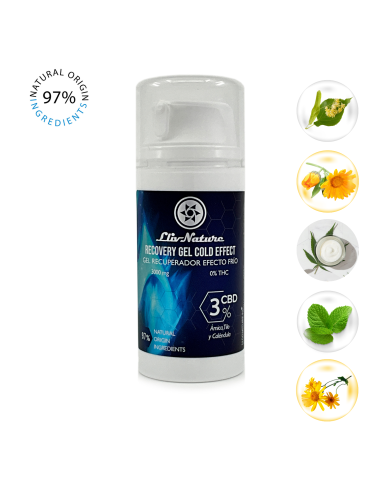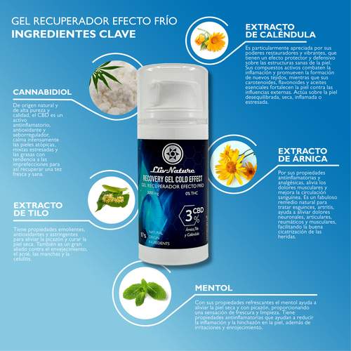 Gel de Recuperación muscular Efecto Frío inmediato y duradero formulado con Mentol, Extracto de Tilo, Caléndula, Árnica y Cannabidiol para la descongestión y alivio de contracturas y sobrecargas, mejorando el rendimiento de la musculatura. Contiene un 97% de ingredientes de origen natural. Todo tipo de pieles. Acelera la recuperación muscular. Indicado para contracturas, esguinces, artritis, tendinitis, calambres, pies y piernas cansados y contusiones.