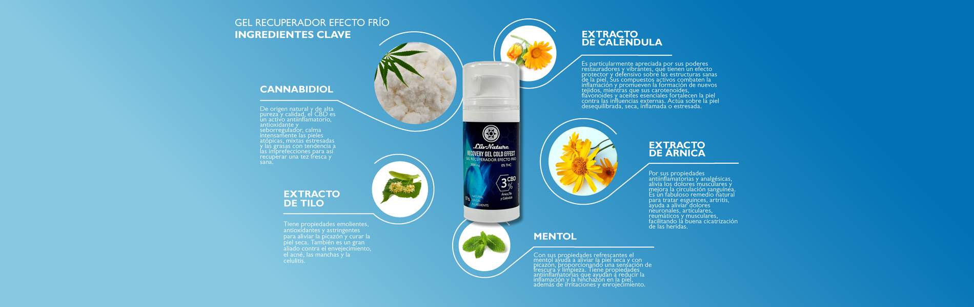 Las cremas de acción Efecto Frío tienen como principal objetivo reducir el dolor y los espasmos musculares provocados por las lesiones, se utilizan cuando hay una inflamación y favorecen la recuperación, bien sea después de una sesión de ejercicio físico intenso o patología tendinosa, reducen la inflamación y alivian el dolor en las primeras fases de una lesión, como esguinces, torceduras o contusiones. Reduce la fatiga después de un largo y estresante día en tus tareas cotidianas. El gel de Recuperación muscular efecto frío inmediato y duradero contiene un 97% de ingredientes botánicos de origen natural con propiedades antiinflamatorias, analgésicas, cicatrizantes, antioxidantes y estimulan el crecimiento celular y la circulación sanguínea, como son el Mentol, el Extracto de Tilo, la Caléndula, la Árnica y el Cannabidiol.