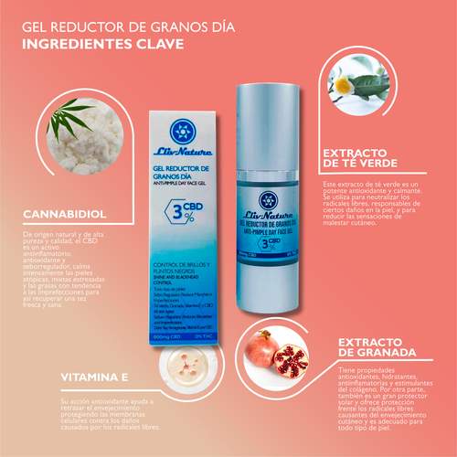 Con el gel reductor de granos día, formulado con un 96% de ingredientes de origen natural, te ayudaremos a reducir las espinillas, controlar los brotes y a minimizar la aparición de marcas e imperfecciones. El Té Verde es un gran antioxidante y astringente natural que regula la producción de sebo, combate las imperfecciones y neutraliza las bacterias causantes del acné. El Extracto de Granada favorece la aparición de cicatrices y regula las células encargadas de la producción de colágeno y elastina. Y el Cannabidiol reducirá la inflamación y regulará el sebo.