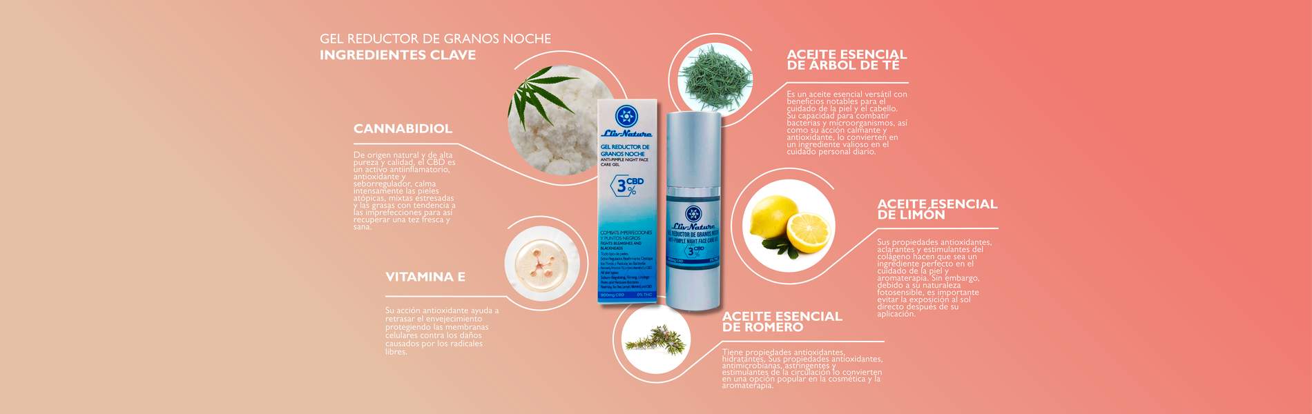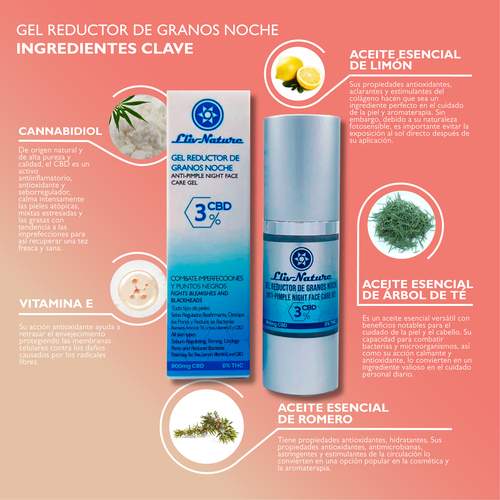 Gel Facial de textura ligera y no graso que ayuda a reducir los granos, abre los poros obstruidos y reduce visiblemente las imperfecciones. Contiene un 95% de ingredientes de origen natural. Su fórmula con Aceites Esenciales de Romero, Árbol de Té, Limón, Vitamina E y Cannabidiol aporta propiedades regeneradoras, elimina las células muertas de la piel y previene la aparición de más imperfecciones. Todo tipo de pieles.