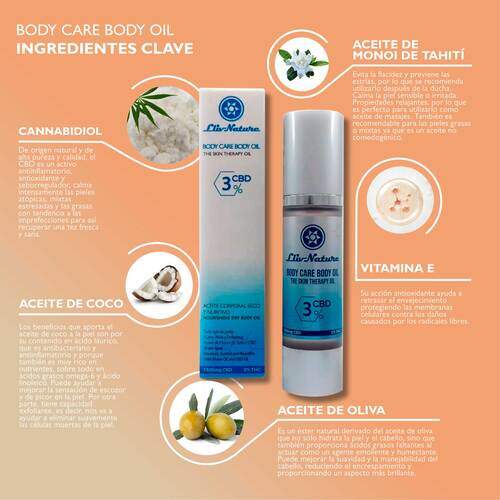 Nuestro Body Care Body Oil es un aceite corporal no graso ni comedogénico que mejora la elasticidad y nutre en profundidad dejando la piel más flexible y tersa. Su exclusiva fórmula combina nuestro Cannabidiol natural, Vitamina E, Aceite de Monoi de Tahití, Aceite de Coco y Aceite de Oliva. Este aceite intensivo corrector ayuda a reducir la sequedad, la tirantez y las estrías. Contiene un 99% de ingredientes de origen natural. Apto para todo tipo de pieles y suave aroma a flores.